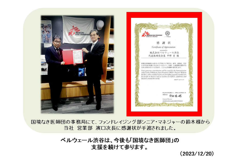 TOP > ベルウェールニュース > 「国境なき医師団」より感謝状が授与されました!