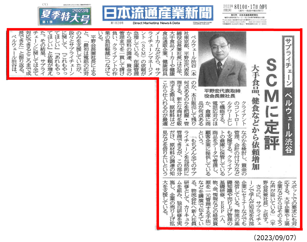 「日本流通産業新聞(令和5年8月10日17日合併号)」の「多角化するコールセンター企業の通販支援」という特集記事のなかでベルウェール渋谷が、「サプライチェーンに強みをもつ企業」で取り上げられました。是非ご一読ください。