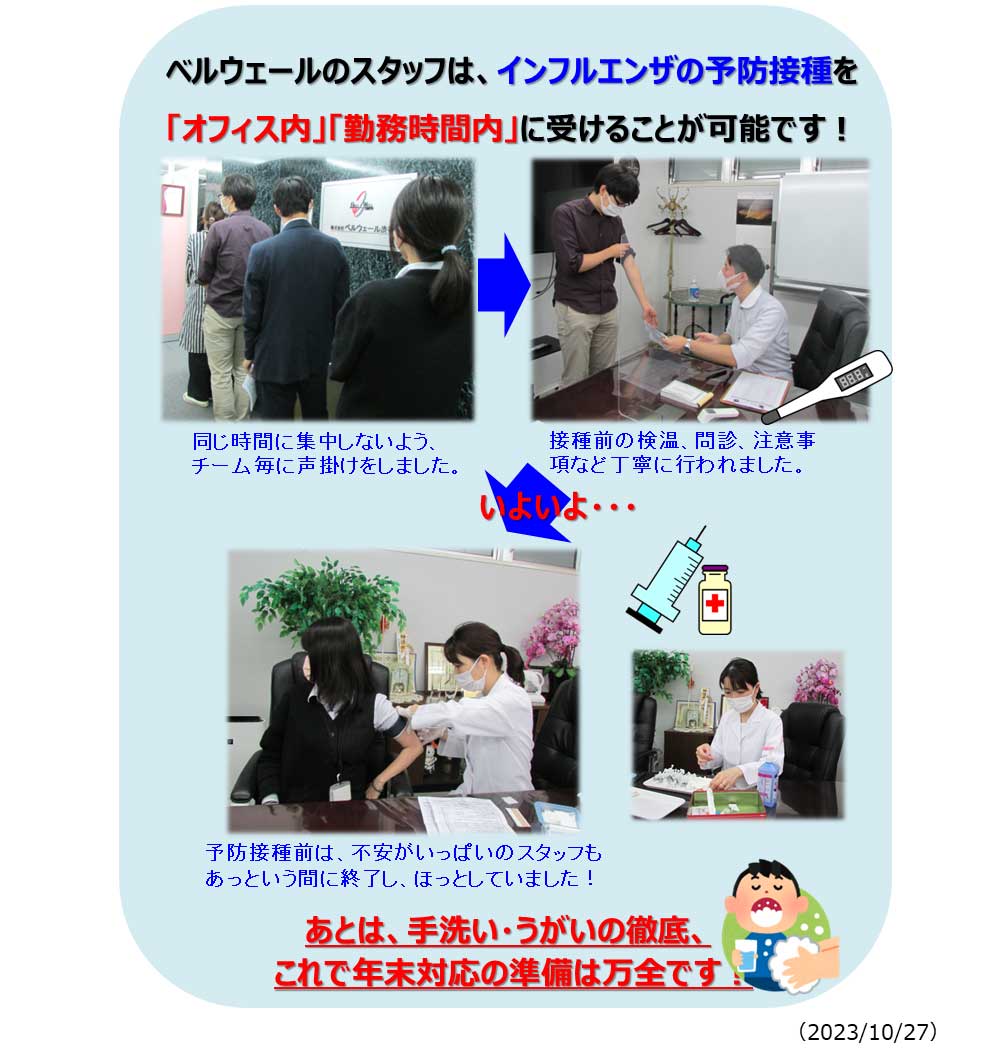 ベルウェールグループでは、福利厚生『健康管理サービス』の一環として、毎年インフルエンザの予防接種を実施しています。